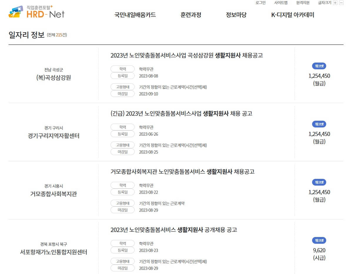 아래는 현재 직업훈련포털 사이트에서 생활지원사 채용공고 일자리 정보가 있어 참조한번 해보시기 바랍니다.