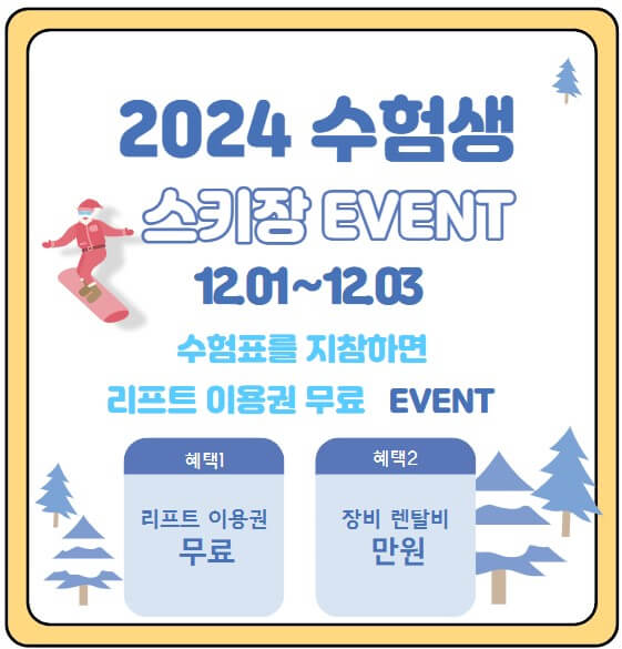 2024 대학수학능력시험 수험표를 지참한 고객에 한해 리프트 무료 이용권을 제공하게 되는데요. 3일간 제공하게 되어 개인 스키장비가 구비되어 있다면 3일간 무료로 스키를 즐길 수 있습니다.